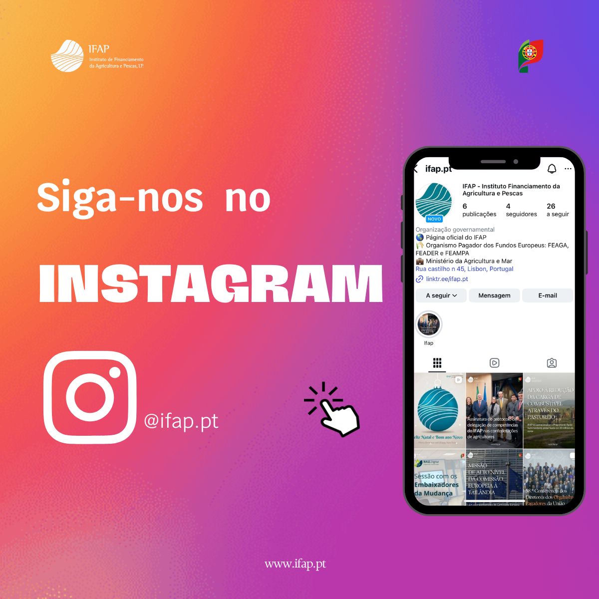 O IFAP acaba de lançar o seu perfil oficial na rede social Instagram, reforçando a sua estratégia de comunicação digital e de proximidade com os seus beneficiários.